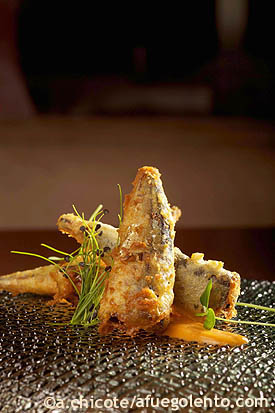 Agujas en tempura con salmorejo de vainilla