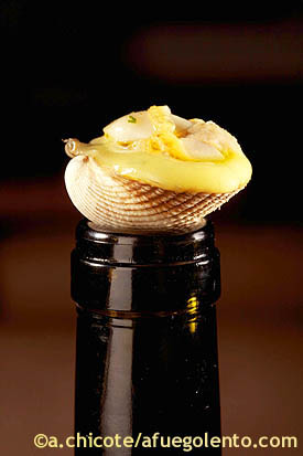 Rellenamos 1 de las conchas del berberecho con el pil pil y colocamos el berberecho encima, Damos un golpecito de calor y servimos inmediatamente