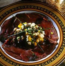 Salpimentar el bonito y aliñar con la vinagreta. En el centro del plato, poner un montoncito de alubias y decorar con unas hojas de cebollino.