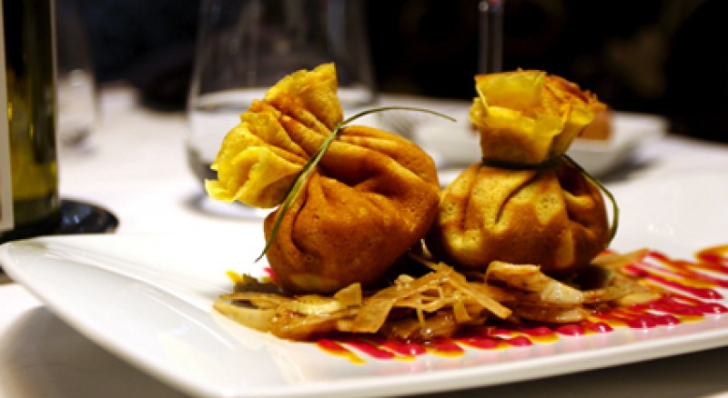 Aumônières de crêpe al curry y gamba, ensalada de hinojo crujiente a la vinagreta de cítricos