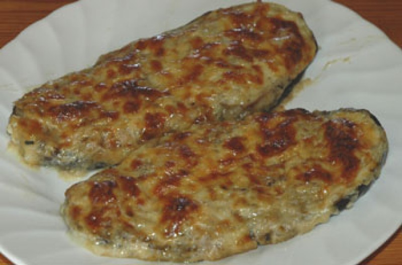 Se cortan las berenjenas por la mitad, se le dan unos cortes y se ponen en el horno y se vacían. Se prepara un sofrito de cebolla tierna, se le añade el atún, la carne de la berenjena y se mezcla bien. Se rellenan las berenjenas, se cubre de bechamel y queso rallado y se ponen en el horno hasta que se doren.