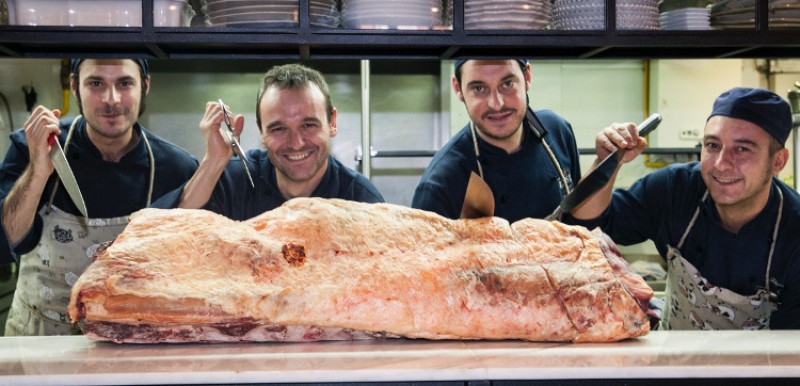 Su chef, Alfonso Castellano, viajó hace unas semanas a Silleda, un pueblecito de Pontevedra, para conocer a la vaca de la que adquiriría el lomo completo. De raza rubia gallega, criada con mucho mimo por José Manuel, fue cepillada diariamente (lo que hace que la grasa se infiltre y se distribuya por todo el cuerpo) y alimentada a base de maíz, cereales y salvado de trigo del molino de la aldea contigua. Fue sacrificada el pasado 10 de noviembre en el matadero de Bandeira, y llevada a la Carnicería Cuiña, donde Miguel la troceó y la ha mantenido en su cámara, exenta de humedad, para su correcta maduración.