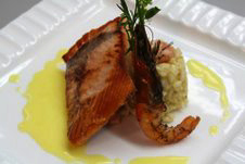 Cocinar el salmón con hierbas de su gusto a la plancha o en una sartén, luego preparar el risoto en una olla mediana sofriendo primero la cebolla y agregar el arroz, luego agregue los mariscos y que se doren, vierta el vino blanco y dejar reducir un poco. Luego agréguele poco a poco el caldo de pescado hasta que el risoto este listo y afine su sabor con la mantequilla y el parmesano.