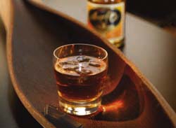 Poner hielo en cubitos en un vaso tumbler y añadir el licor y el ron. Servir acompañado de los trocitos de chocolate.