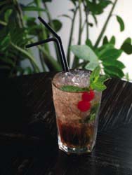 Decorar con las cerezas y las hojas de menta dispuestas en forma de abanico.