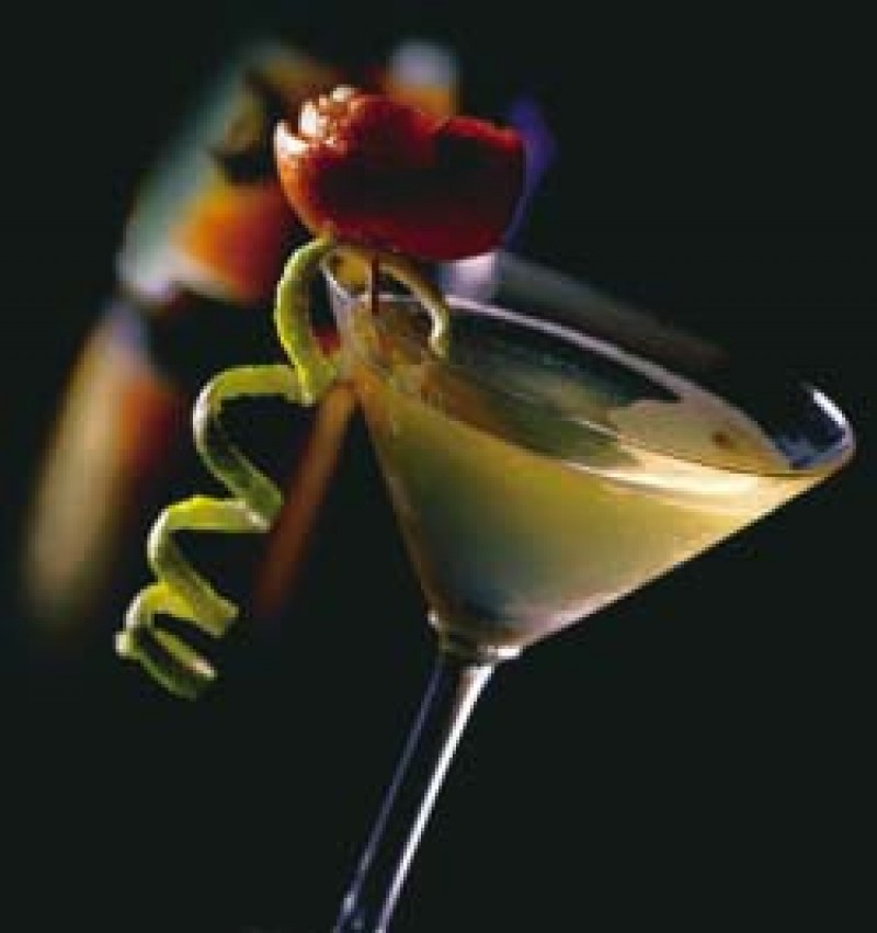 Introducir todos los ingredientes en una coctelera y agitar. Servir en una copa de Martini y decorar.