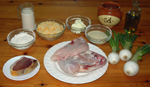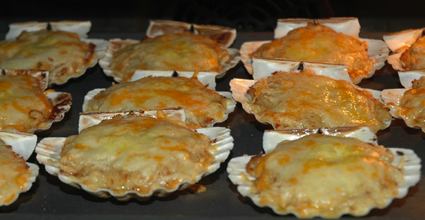 Se hace una bechamel con cebolla, harina, leche, gallina y jamón. Se ponen en las conchas, se cubren con pan y queso de bola rallado y con un poco de margarina. Se meten en el horno y cuando está doradica se sirve. Si no se tienen conchas se ponen platicos de aluminio.
