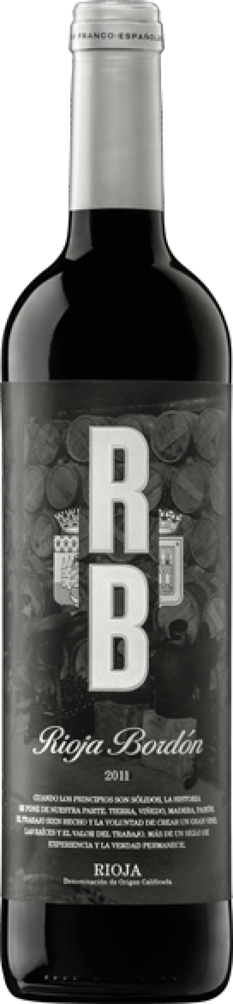 RBRioja Bordón 2011D. O. C. Rioja. RB Rioja Bordón es un vino elaborado con la variedad 100% Tempranillo. 13 % Vl. La desacidificación maloláctica se produce en barrica de roble americano nuevo de tostado medio. El vino es criado en barrica de roble americano y francés durante 12 meses. De color rojo picota con ribete rubí oscuro. En nariz expresa matices de frutos rojos y especias sobre fondo de regaliz. Muy redondo y equilibrado de buena estructura y paso suave. Rico,moderno que sorprende por su expresividad. Además, sus botellas visten etiquetas que cambian y que hacen del RB Rioja Bordón una combinación perfecta de historia y modernidad. Un vino seleccionado que relanza y pone en primer plano los valores de la bodega.