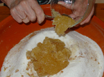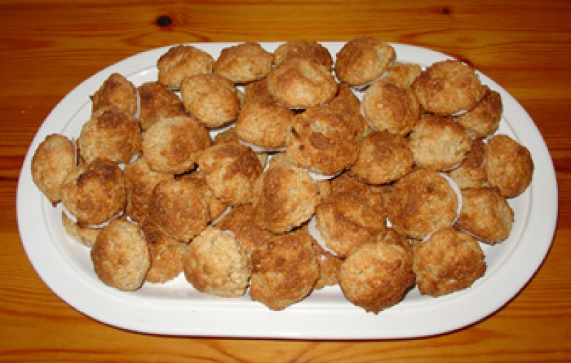 Se ponen en un recipiente todos los ingredientes y se amasan muy bien. En la bandeja del horno se ponen las obleas con bolitas con la masa. Se meten en el horno a 200 grados 20 minutos.