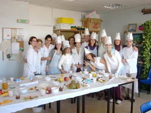 También hicimos un taller con los niños ingresados en la planta infantil, preparamos unos bombones de chocolate y frutas y como muchos de los niños nos dijeron que les gustaban mucho los pasteles de nata, les prometimos que un día volveríamos para preparar uno y como las promesas las cumplimos, volvimos, ya os contaré...