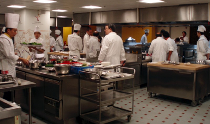 Los cocineros empezaron con clases prácticas. Formaron equipos de dos y tres. Cada equipo tenía su estación de trabajo, con wok, fuego a propulsión y la olla de vapor con cestas. Se pusieron a preparar el primer plato, un tipo de pescado llamado Mandarin, salteado con crisantemos (ese mismo plato degustamos la noche anterior en el Hutong). Primero cortaban los filetes de pescado, luego la carne en juliana, después rebozaban y freían la cabeza y las espinas con la cola. Se salteaba todo en el wok y se presentaba encima de una bandeja colocando primero la cabeza y espina frita en medio y después el pescado salteado encima haciendo la forma del pescado antes de despezarlo. Lo terminaron con los pétalos de crisantemo.