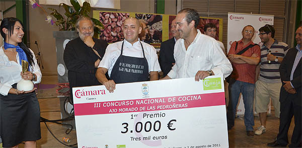 El cocinero Federico Guajardo, del Restaurante Sal de Mar, de Denia (Alicante) se ha alzado con el primer premio del III Concurso Nacional de Cocina Ajo Morado de Las Pedroñeras. Joaquín Baeza, del Gran Hotel Campillo, en Madrid, ha logrado el segundo premio mientras que Jorge López, del Restaurante El Germinante, en Alcira (Valencia) ha conseguido el tercer galardón. Todos los finalistas han recibido su peso en ajos como obsequio