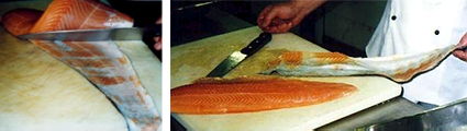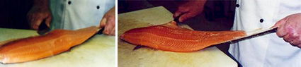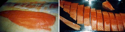 Completada la tarea puedes mantener el lomo del Salmón de una sóla pieza para cocinarlo, por ejemplo al horno; o filetearlo en chuletitas, las cuales puedes emplear para cocinarlas individualmente sobre la sartén, el grill o la barbacoa.