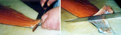 Comienza por la cola del salmón o el pescado que estés manipulando. Efectúa un pequeño corte que te permita pinzar con los dedos la piel del mismo.