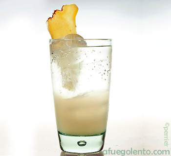 Ponemos todos los ingredientes, menos el agua, directamente en el vaso con hielo picado. Mezclamos bien y completamos con el agua con gas