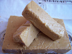 Mientras tanto, con el almíbar sobrante de hervir las yemas, preparamos un baño pasándolo por el colador incorporándole unas gotas de limón y poniéndolo al fuego hasta que alcance la densidad de 33ºC. Una vez alcanzada esta temperatura, lo batimos y echamos sobre una piedra de mármol donde se sigue trabajando hasta convertirlo en una pasta muy blanda y fina. Lo ponemos al baño maría sin que cese de hervir el agua del baño. Bañamos en él las yemas una a una y las vamos colocando sobre un mármol para que se sequen. Una vez bien secas, las envolvemos en un papel adecuado.