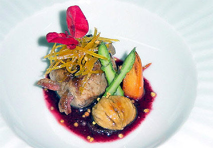 Se dejan los solomillos durante un día en adobo (con hierbas, vino tinto y verduras), luego se mechan con el ibérico, los envolvemos con la crepineta de cordero y los marcamos en una sartén.