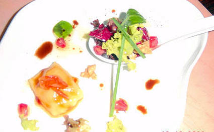 Ensalada de nueces, granada y ravioli caramelizado de piña relleno de ostras (para 4 personas):