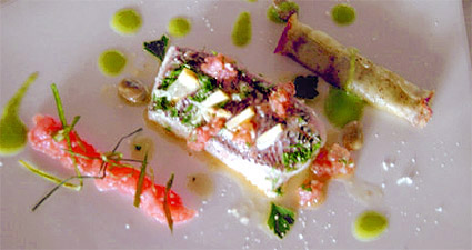 Besugo al horno con puré de tomate y canelón de patata rellena de habas en su jugo (4 pers.):