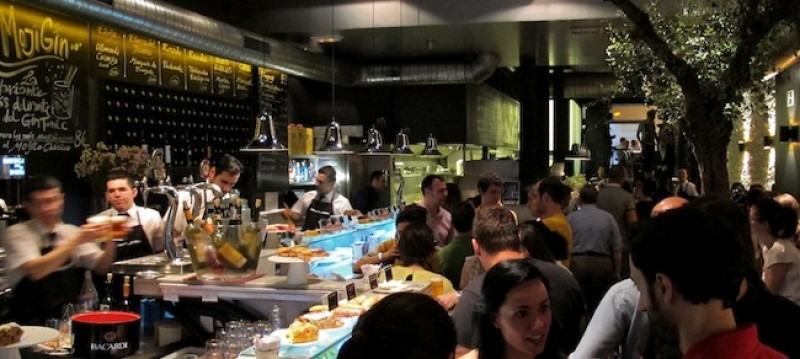 Según entras estás en la zona de tapeo, donde tienes una vitrina con muchos pinchos y raciones, y una enorme y jugosa tortilla de patata con cebolla caramelizada que hace la boca agua sin haberla probado. Moderno pero acogedor (algo muy dificil), así es la entrada; mesitas altas, sillas en la barra, gente de pié picoteando y pizarras colgadas en las paredes donde puedes ver su oferta culinaria. Su cocina es non-stop, abre de 11 de la mañana a 2 de la madrugada sin interrupción, por lo que puedes pasarte a cualquier hora a disfrutar de sus croquetitas de boletus, su pincho de tartar de salmón o sus huevos fritos de corral.