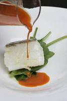 -Bacalao con tirabeques, espinacas y jugo de pimiento rojo asado (Casa Solla)