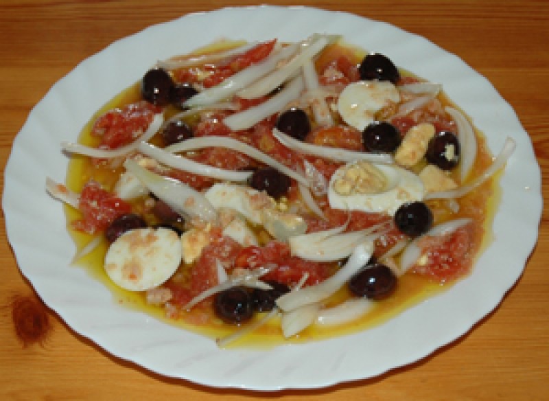 Se corta el tomate de pera en conserva a trozos, la cebolla tierna a tiras finas y los huevos duros en rodajas. Se le añade el atún, las olivas negras, sal y aceite de oliva. Listo para comer.