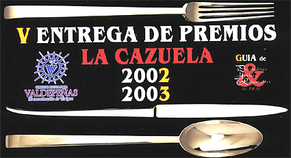 La Cazuela, en colaboración con el Consejo Regulador de Denominación de Origen de Valdepeñas, hará entrega de los Premios La Cazuela, que este año entran en su quinta edición, en el transcurso de una gala el 11 de junio de 2002. Como cada año, la gala tendrá un carácter benéfico, puesto que los donativos recaudados se destinan a la Organización No Gubernamental Médicos del Mundo, y contará con la participación de distintas personalidades, como la Directora General de Turismo de la C.A.M, Doña Teresa Caramé, o personajes del mundo del espectáculo y la comunicación, Miss España 88, Mª José Besora y Consuelo Berlanga.