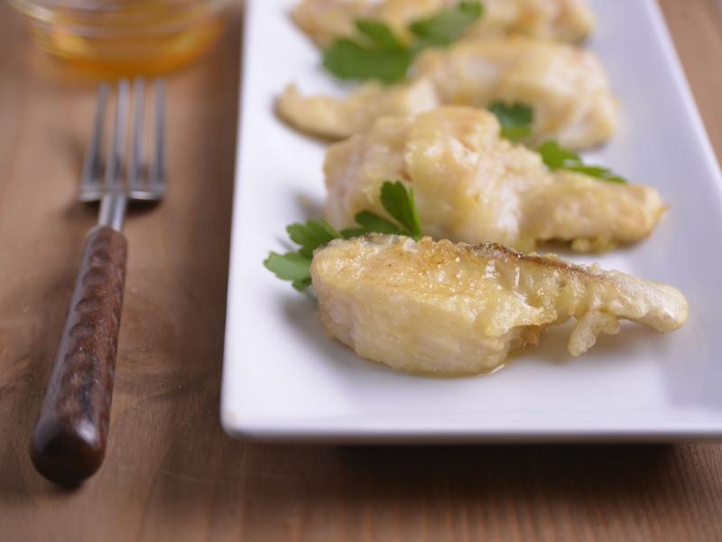 Por separado, troceamos el pescado para pasarlo primero por harina y luego por la mezcla que hemos preparado en el paso anterior. Lo freímos en una sartén con aceite muy caliente hasta que esté dorado.