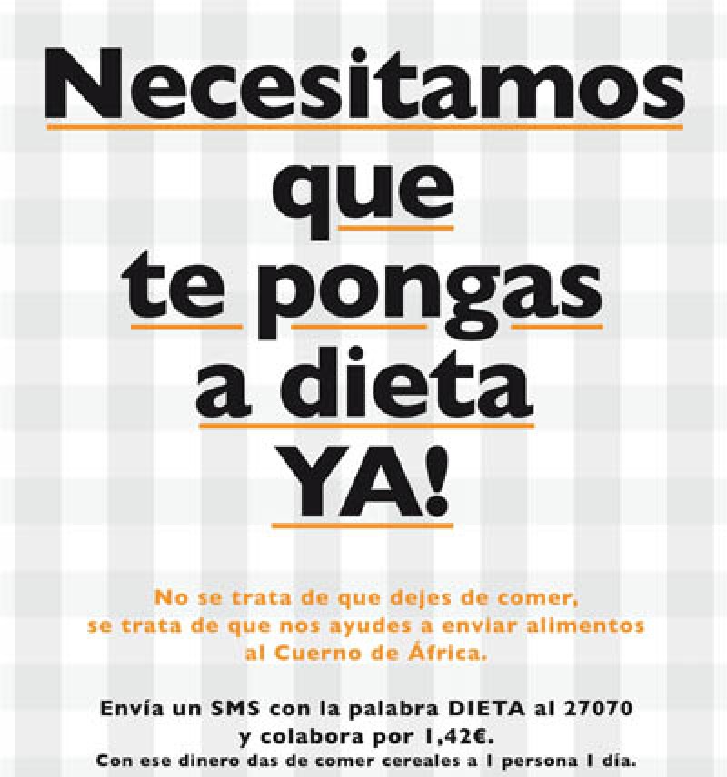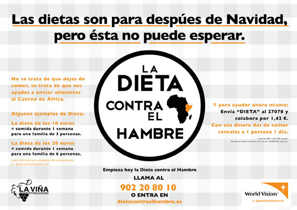 La Dieta contra el Hambre de World Vision es una original iniciativa para invitar a los españoles a ponerse “a régimen” sin dejar de comer o pesarse a diario. Se trata de una dieta simbólica en la que lo importante es hacer una donación para que los niños que sufren malnutrición en el Cuerno de África reciban alimentos, suplementos nutricionales, agua y atención médica. Por ejemplo, con una dieta de 10€ facilitamos la comida de una semana para una familia de 3 personas y con una de 20€ es posible llevar comida durante una semana para una familia de 6 personas