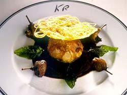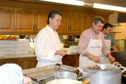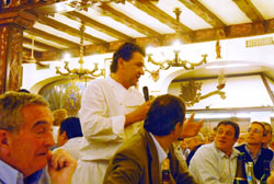 El menú estuvo compuesto de una sopa magnífica de pescado hecha por Peru Almandoz, del restaurante Urepel, luego unos calamares en su tinta troceados, cocinados por mi gran amigo de la infancia y que es como un hermano Tomás Santacana del restaurante Politena, y luego mi plato: Codornices rellenas de pétalos de rosa y foie con salsa de oporto. De postre, tejas y canutillos de Tolosa y helados de Los Italianos, casa histórica donostiarra. Antes, hay que decirlo, se tomó en las instalaciones de la sociedad un aperitivo hecho por los socios de la agrupación. Como la sociedad es pequeña la comida para tantos invitados que éramos se sirvió en Gaztelubide, otra sociedad, que está puerta con puerta.