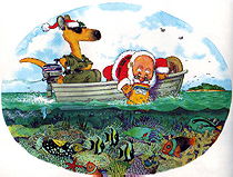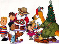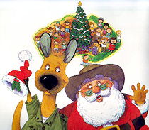 Ahora cuando Diciembre llega a los soleados confines de Australia, Santa Claus hace una llamada muy especial. . . al Canguro Dorado, quien trae regalos a tí y a mí, y una verdadera Navidad Australiana a todos nosotros.
