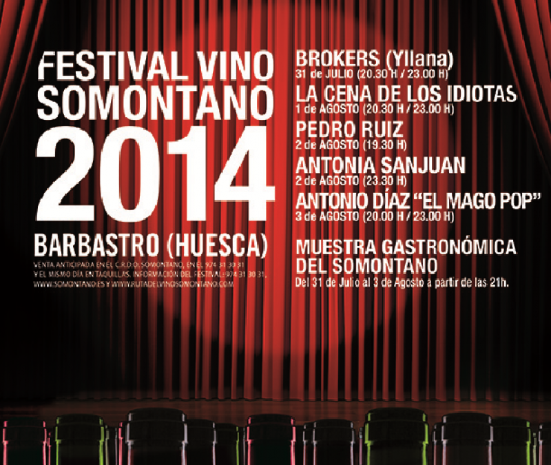 Desde el año 2.000, el primer fin de semana del mes de Agosto llega a Barbastro y el Somontano el Festival del Vino Somontano: Cuatro noches en las que el maridaje gastronómico de vinos y tapas se alía con la cultura dejando paso por el día a una oportunidad única para conocer y disfrutar de las múltiples propuestas de la Ruta del Vino Somontano. Las artes, el teatro y la gastronomía en un maridaje perfecto con el vino. El Festival celebra su decimoquinta edición, con una evidente apuesta año tras año por el enoturismo, que en este 2014 se potencia aún más.