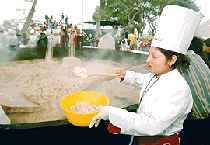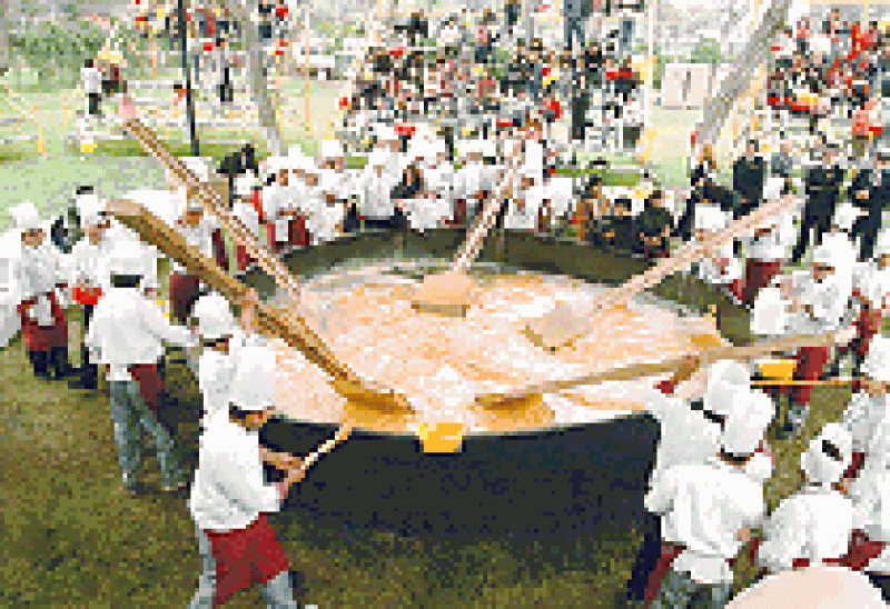 En la gigantesca sartén -cuyo diámetro sobrepasa los cinco metros- los cocineros colocaron 15.000 huevos,