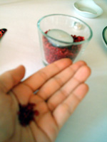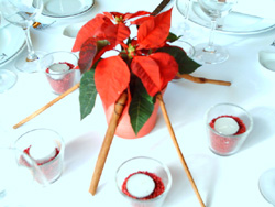 Para realizar el primero necesitamos una Ponsettia, o flor de Pascua, que colocaremos en el centro de la mesa (3.50 euros) y cinco velas (1 euro) introducidas en un vasito cada una. Además, 5 ramas de canela, sal gorda y un chupito de granadina con el que teñiremos de color rojo la sal gorda de los vasitos.