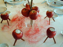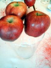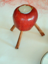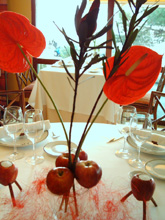 Los elementos que necesitamos son los siguientes: manzanas rojas (tantas como velas queramos colocar en la mesa y tres más para el centro), un recipiente de cristal, velas, canela, dos ramas de Anthurium, dos de Leucadendro y un poco de sisal (fibra) de color rojo para que todo quede en el mismo tono.
