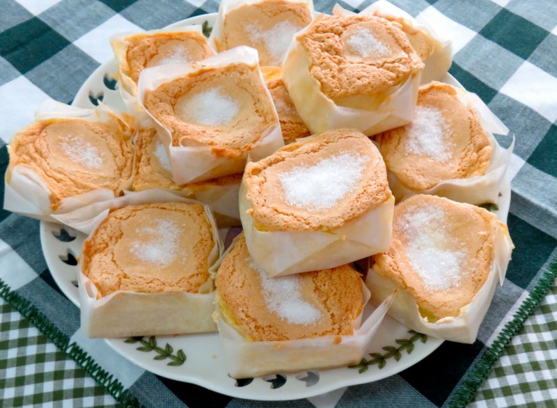 Verdaderamente estas magdalenas son superligeras, semejantes a aquellos bizcochos que solo llevaban huevos, azúcar y un poco de harina; y, sin lugar a duda, son las más delicadas y exquisitas, y quizá por eso tengan una elaboración más cuidadosa. Esta receta pertenece a una familia granadina "de casa grande de las de antes", que a falta de televisión las hacendosas amas de casa se entretenían montando los cuadraditos de papel, que eran de lo más "collejo". Yo las probé al poco tiempo de llegar a Granada, regalo de un miembro de aquella familia ilustre que había decidido comercializarlas — con el enfado de la familia que lo consideró una verdadera afrenta—. Muchísimos años después conocí a una hermana de este emprendedor, que no tuvo ningún reparo en darme la receta y empecé a elaborarlas; incluso me divertía hacer las cajitas de papel y, a falta de papel de barba, que posiblemente ya ni existe, las hago con papel de hornear, o simplemente con folios. Si os digo que su envasado es una actividad terapéutica, quizá os apetezca ponerme verde en Facebook, pero cada vez estoy más convencida de que la satisfacción que da sacarlas del horno con su bonita envoltura y su aspecto de puro diseño, responde al nombre de mi colección: La Cocina como Terapia.