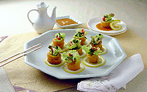 7. Se cortan por la mitad y se colocan en una fuente. Se prepara la salsa de soja agria.