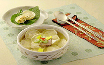7. Se adereza y se cuece el caldo de buey. Se cuecen ligeramente los dumplings en el caldo de buey hirviendo y se adereza la sopa con el huevo en forma de rombo, el pimiento rojo, la cebolleta.