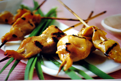 Calentar el horno 200ºC, colocar las brochetas sobre un papel sulfurizado y cocinar el pollo durante 3 minutos de cada lado; Servir caliente con la salsa de cacahuetes.