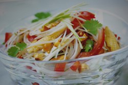 En un recipiente mezclamos el mini maíz, junto con el chili rojo cortado en julianas, el zumo de lima, la salsa de soja, los piñones tostados, el azúcar, los tomates en dados, la cebolla tierna y por último el cilantro picado.
