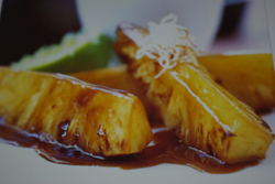 Por otro lado calentar una sartén, añadir la mantequilla. Cuando esta esté caliente colocar la piña, saltear durante 2 minutos y agregar el azúcar negra. Una vez que este el azúcar caramelizada agregar la leche de coco junto con el zumo de lima.