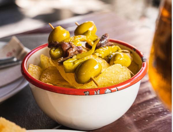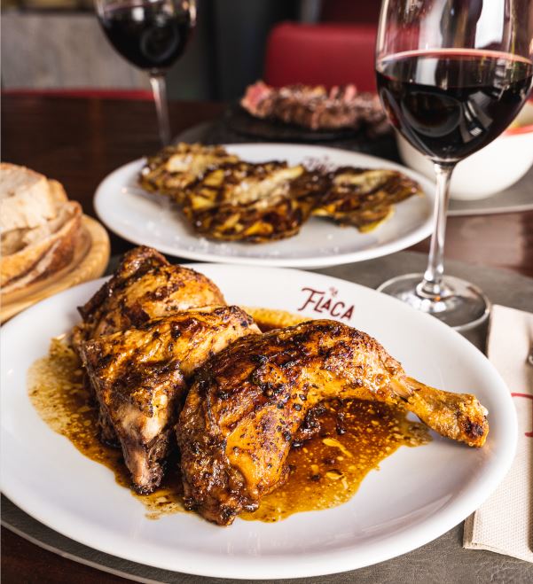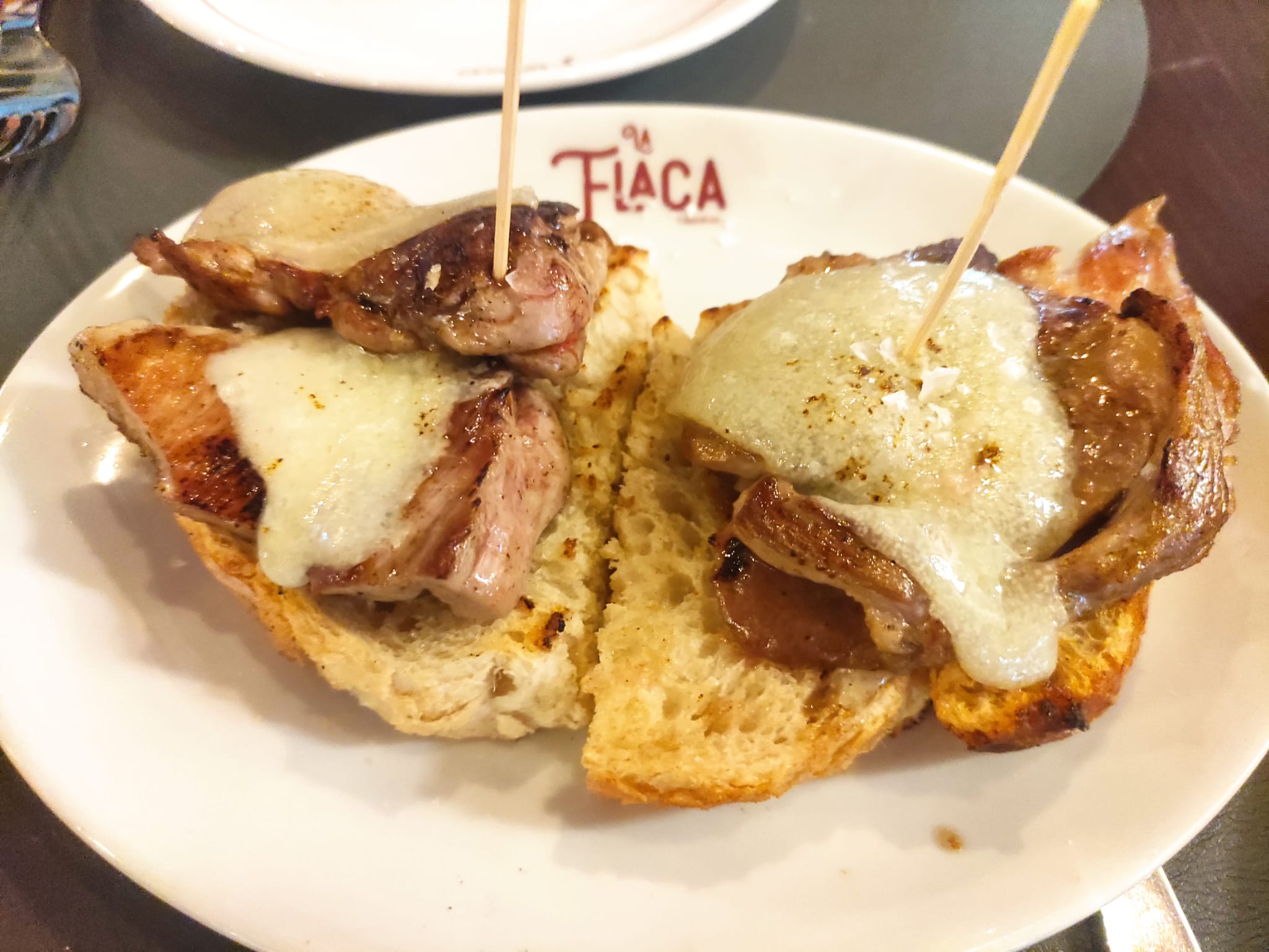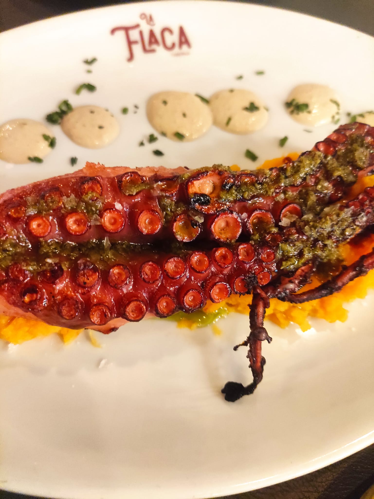La Flaca no se entiende solo por su carta, aunque ojo, es una joya, sino por su actitud. Aquí no hay platos con florituras, hay sabor directo, recetas españolas con chispa y desparpajo. Desde las bravas de Mila, que se han ganado nombre propio, a los torreznos de Soria con revolconas, el pincho de tortilla, los croquetones de mejillón, el pulpo a la brasa con mojo verde, el cachopo, la cecina de León o el ya mítico “medio pollo de mi suegra”. Todo pensado para compartir, celebrar y repetir. Nos gusta movernos al ritmo del momento: menú del día que cambia por temporada y cocina sin horarios.