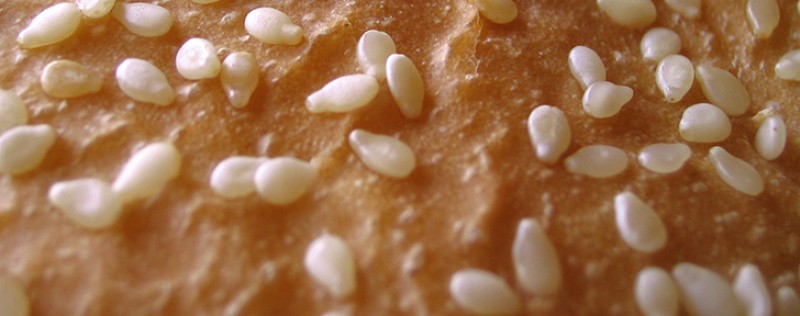 Por otro lado el pan del mismo tamaño y forma e incluso el color, que es controlado por un fotómetro, se descongela horneándolo durante 35 segundos. El pan tiene en la parte superior centenares de semillas de sésamo, cultivadas en el paralelo 22.