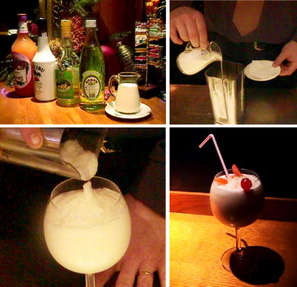 Se baten todos los ingredientes con la batidora eléctrica junto con el hielo picado. Se sirve en una copa de balón decorada con una rodaja de naranja y una guinda.