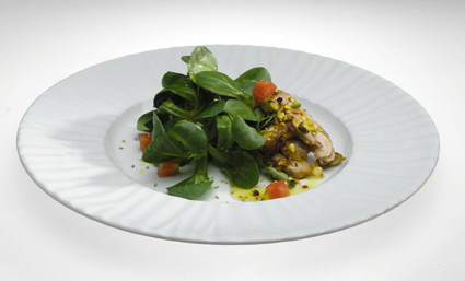 ENSALADA DE CANÓNIGOS CON CONFIT DE PATO Y VINAGRETA AGRIDULCE DE PISTACHOS