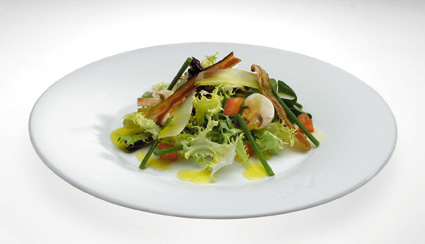 Limpiar los champiñones y cortarlos en láminas muy finas, mezclar con las lechugas y el cebollino en bastones alargados, reservar en el frigorífico.