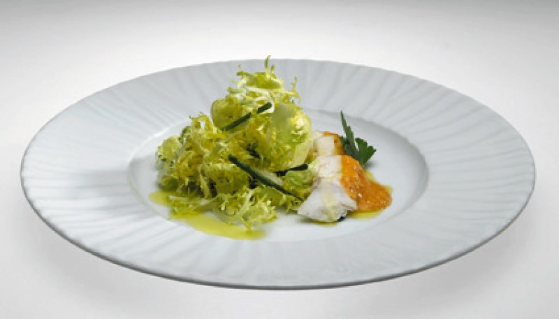 ENSALADA DE ESCAROLA CON BACALAO, CEBOLLINO Y VINAGRETA DE TOMATE