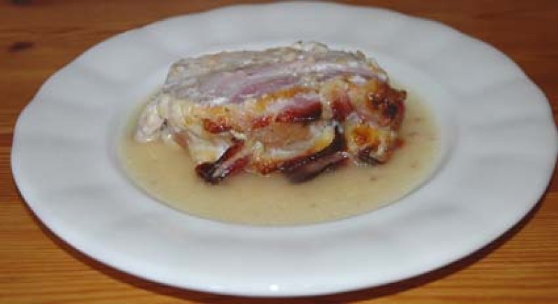 Se corta la cebolla a trocitos y se pone en el fondo de la bandeja. Se sala la paletilla y se le añade pimienta, tomillo, aceite y se embadurna bien. Se pone en la bandeja con las manzanas, los piñones y las castañas que previamente se habrán hervido 10 minutos. Se añade un vaso grande de vino blanco y otro de agua. Se pone al horno una hora y se tritura toda la guarnición.