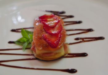 Decorar con la salsa en el fondo del plato y colocar la milhoja.