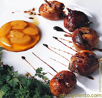 En una parrilla bien caliente, marcar las vieiras (sólo marcar, no deben hacerse). Sazonar las vieiras y colocar 2 o 3 en cada parte cóncava de concha. Repartir las setas alrededor y cerrar con la tapa de la concha. Sellar ambas valvas cerrándolas con el cilindro de hojaldre. Pintar el hojaldre con la mezcla de huevo y agua. Hornear las conchas 15 minutos bien cerradas en un horno caliente hasta que el hojaldre tenga un color dorado
